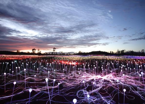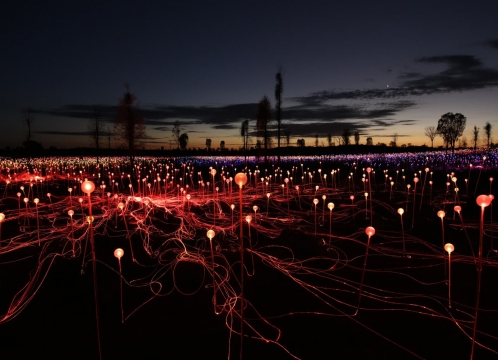 地元のピジャントジャジャラ語で「たくさんの美しい光を見ている」という意味のTili Wiru Tjuta Nyakutjakuと名付けられたこの展覧会は、マンローにとってこれまでで最大の作品です。サッカー場7面分以上という圧倒的な大きさのこの作品は、5万本の光の紡錘からなる幻想的な庭園に没入することを誘います。
