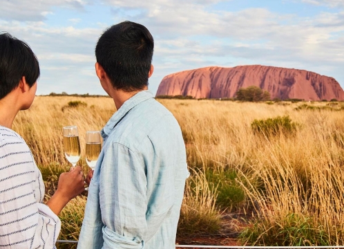 美しいサンセットを眺めながら、優雅なひと時を。スパークリングワインのグラスにエアーズロックを映し込む、人気ショットの撮影ができます。(日の入目安:18:00~19:45)