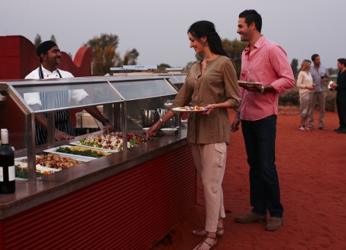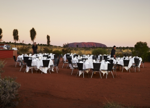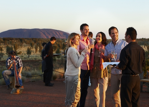 ウルル・カタジュタ国立公園を見下ろす丘にある会場にてカナッペと冷えたスパークリングワインから始まるサウンド・オブ・サイレンス体験。日が沈み暗くなったら、ディジュリドゥの音色を聴きながら、星空の下、忘れられないダイニング体験をお楽しみください。