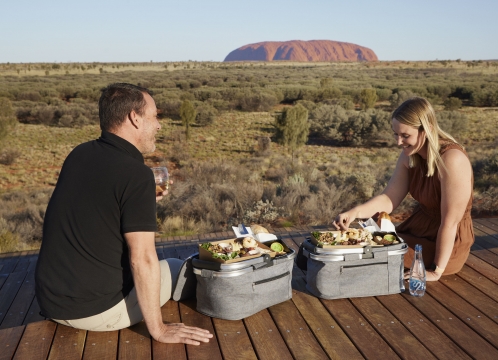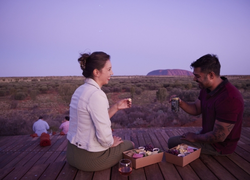 ウルルとカタジュタの両方を見渡す素晴らしい場所で夕陽を眺めながらカクテルをお愉しみください。