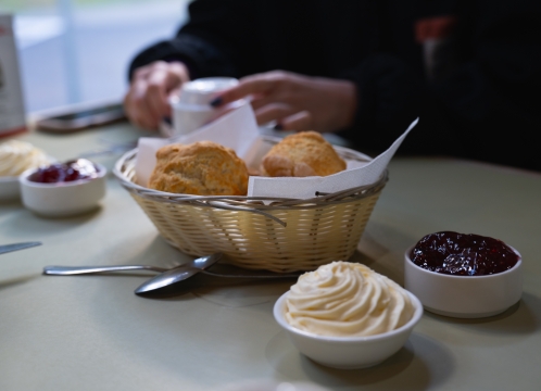 スコーンとモーニングティをお楽しみください。美しいユーカリの木もご覧いただけます。