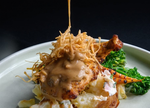 ・ローストチキンシュープリーム(乳製品) シェフの特製シグネチャーポテト | ベビーキャロット | ブロッコリーニ | クリスピーエノキ | マッシュルームソース または