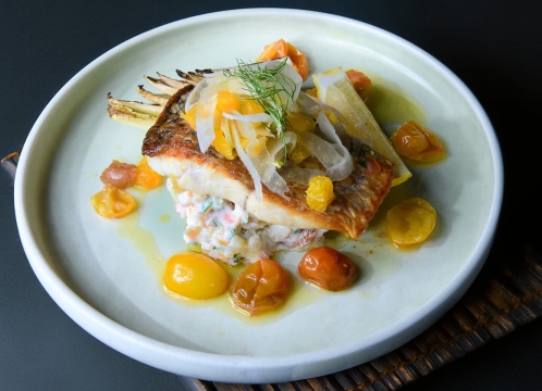 ・ハーブをまぶした本日の魚(乳製品不使用、魚介類、グルテンフリー) ブロッコリーニ | ヘアルームトマトサルサ | オレンジとフェンネルのサラダ | ブラウンバターソース または