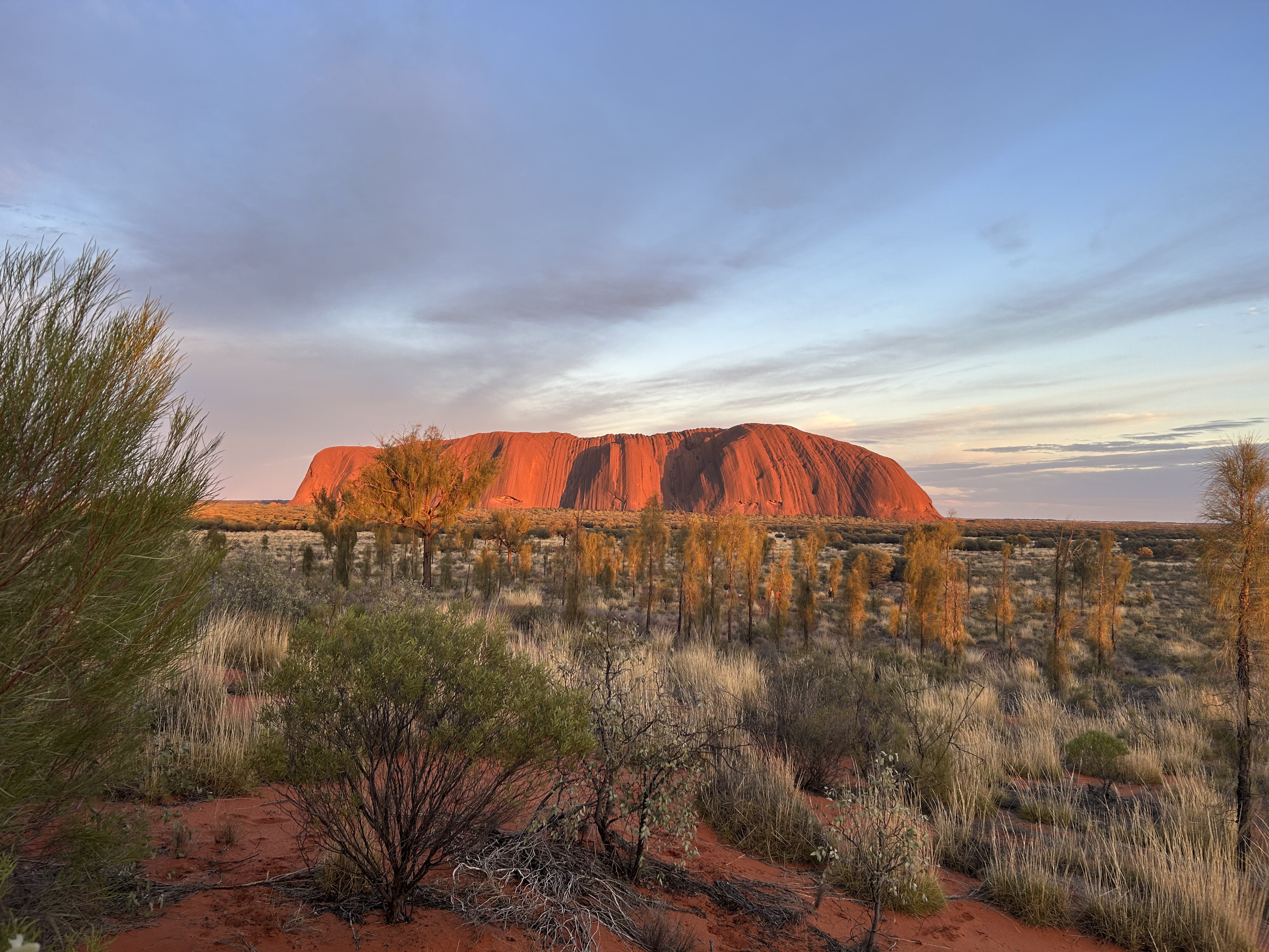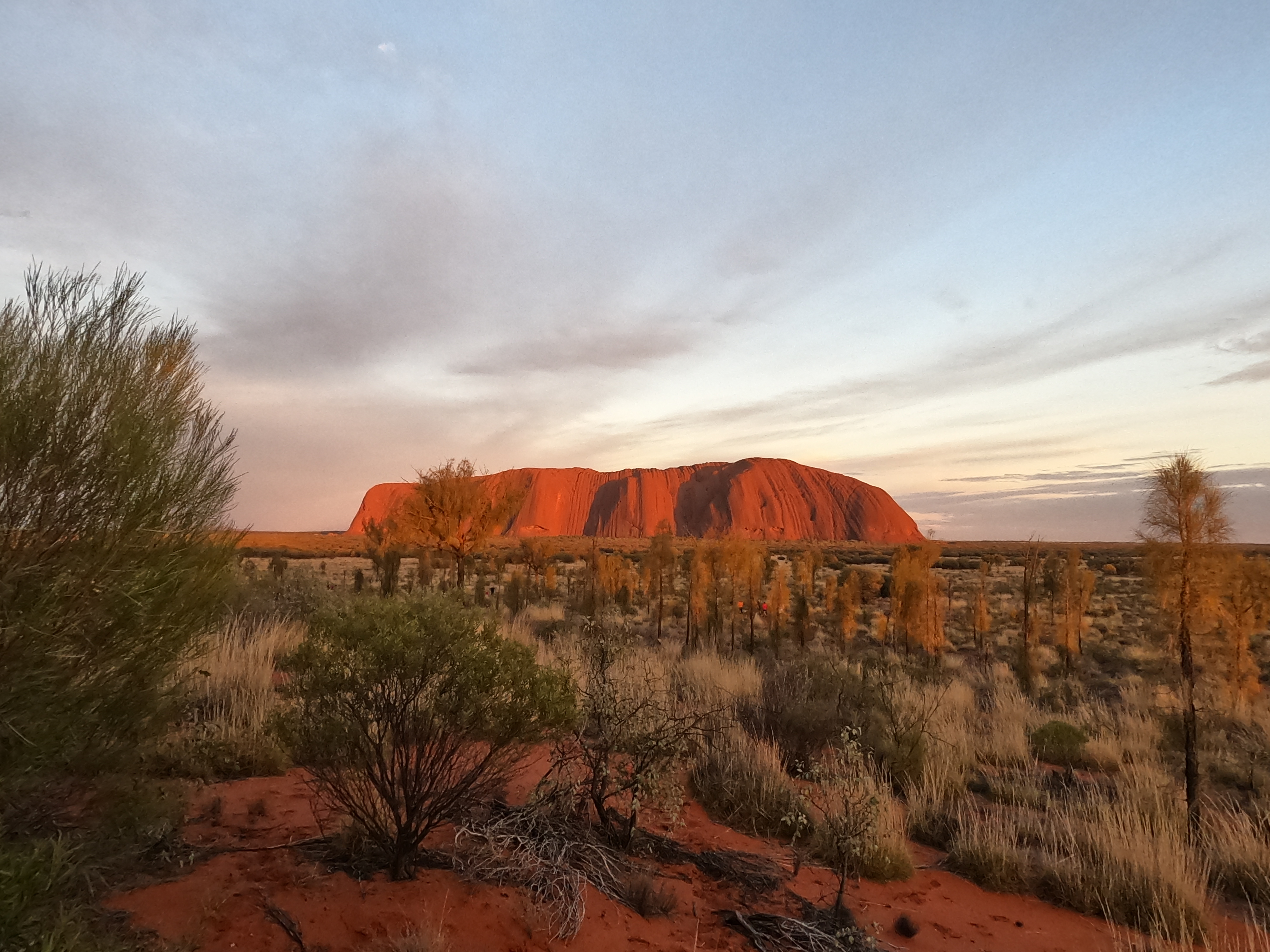 夕陽に照らされて真っ赤に染まるウルル。サンライズとは違う趣があります。