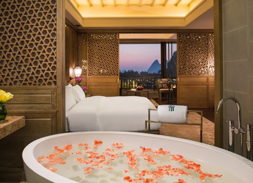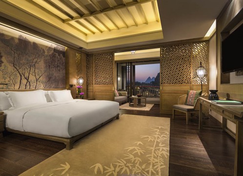 ホテルの前には漓江が流れ、ホテル各所から水墨画の世界そのもの、と謳われる絶景を望むことができます。スイートタイプとヴィラタイプのお部屋からなる5つ星ホテルで、建物は中国の伝統的な建築様式を活かしたモダンなデザインで中国ならではのリゾート感が味わえます。ファシリティも充実。全室で無料Wi-Fiが利用可能なのはもちろん、各部屋、大きなバスタブやかわいいデザインが特徴的なアメニティーが用意されています。ホテルの周囲は自然にあふれた落ち着いた雰囲気となっており、ゆっくり過ごしたい方にピッタリのホテルです。
