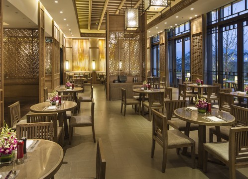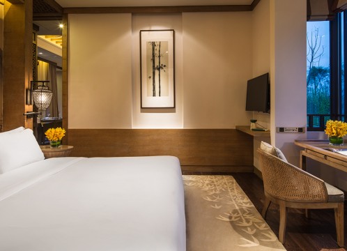 ホテルの前には漓江が流れ、ホテル各所から水墨画の世界そのもの、と謳われる絶景を望むことができます。スイートタイプとヴィラタイプのお部屋からなる5つ星ホテルで、建物は中国の伝統的な建築様式を活かしたモダンなデザインで中国ならではのリゾート感が味わえます。ファシリティも充実。全室で無料Wi-Fiが利用可能なのはもちろん、各部屋、大きなバスタブやかわいいデザインが特徴的なアメニティーが用意されています。ホテルの周囲は自然にあふれた落ち着いた雰囲気となっており、ゆっくり過ごしたい方にピッタリのホテルです。