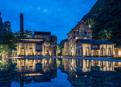 「Alila陽朔」は直ぐそばに漓江が流れる、山奥の立地。最大のポイントはかつての製糖工場の各種設備ををそのままホテルとして再利用しているところです。外観は当時のままに、内装をモダンかつラグジュアリーに改装しており、レトロな雰囲気を味わうことができます。それぞれの建物にはかつてどのように使われていたかを記した案内版があり、往時に思いを馳せながらゆったりとした時間の流れを感じてください。