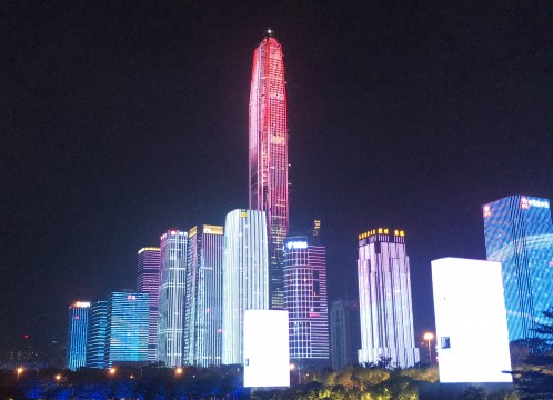 深セン福田地区にある「市民中心」という巨大な公園施設をぐるりと囲む高層ビル35棟と公園に設置された5基のLEDスクリーンを利用して展開される、超大規模なライトショーは日本でも取り上げられ話題となっています。