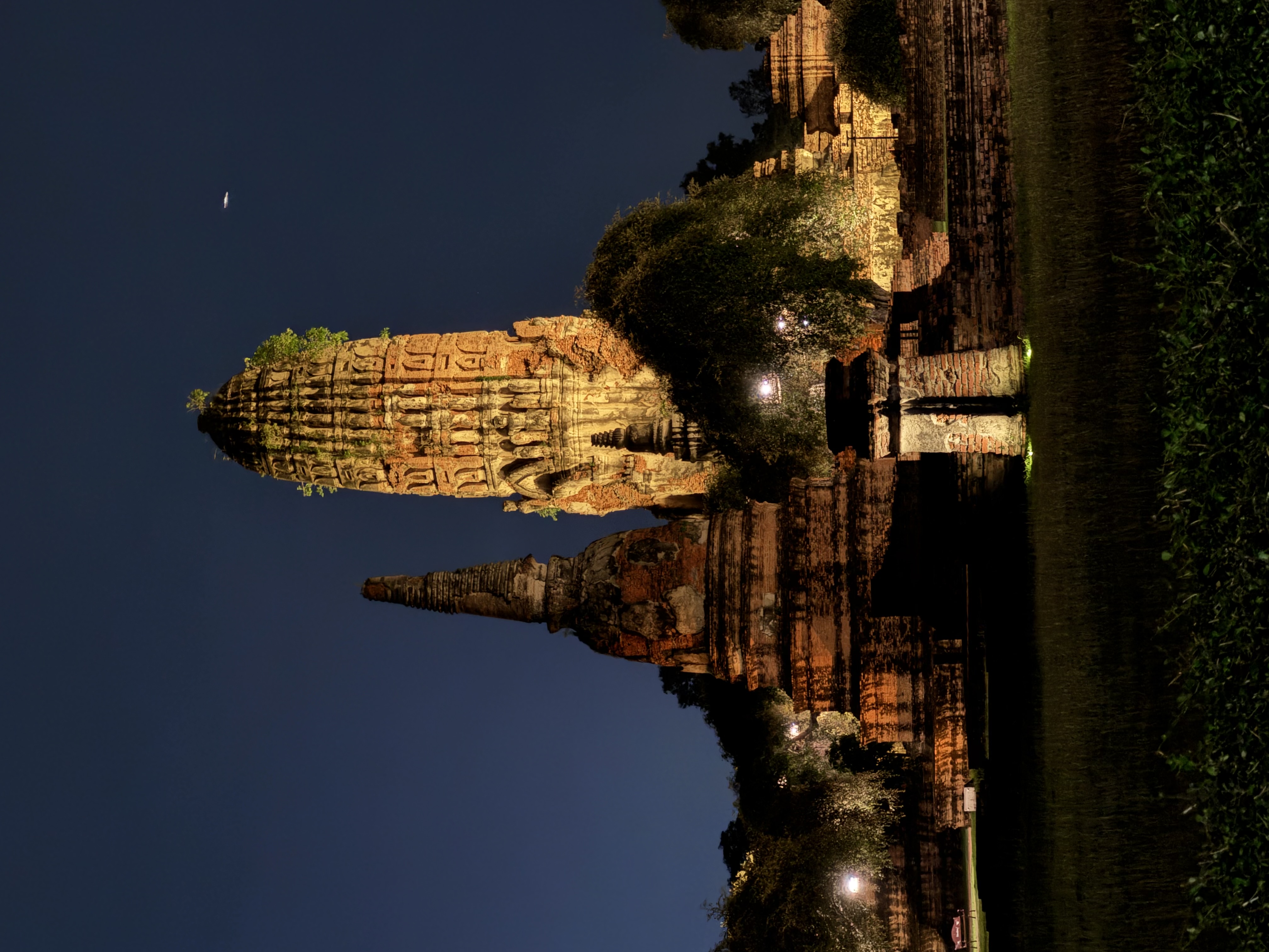 夕陽に照らされる赤と白の仏塔、夜にライトアップで浮かぶ影を纏った荘厳な姿は格別でした。