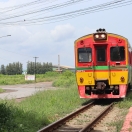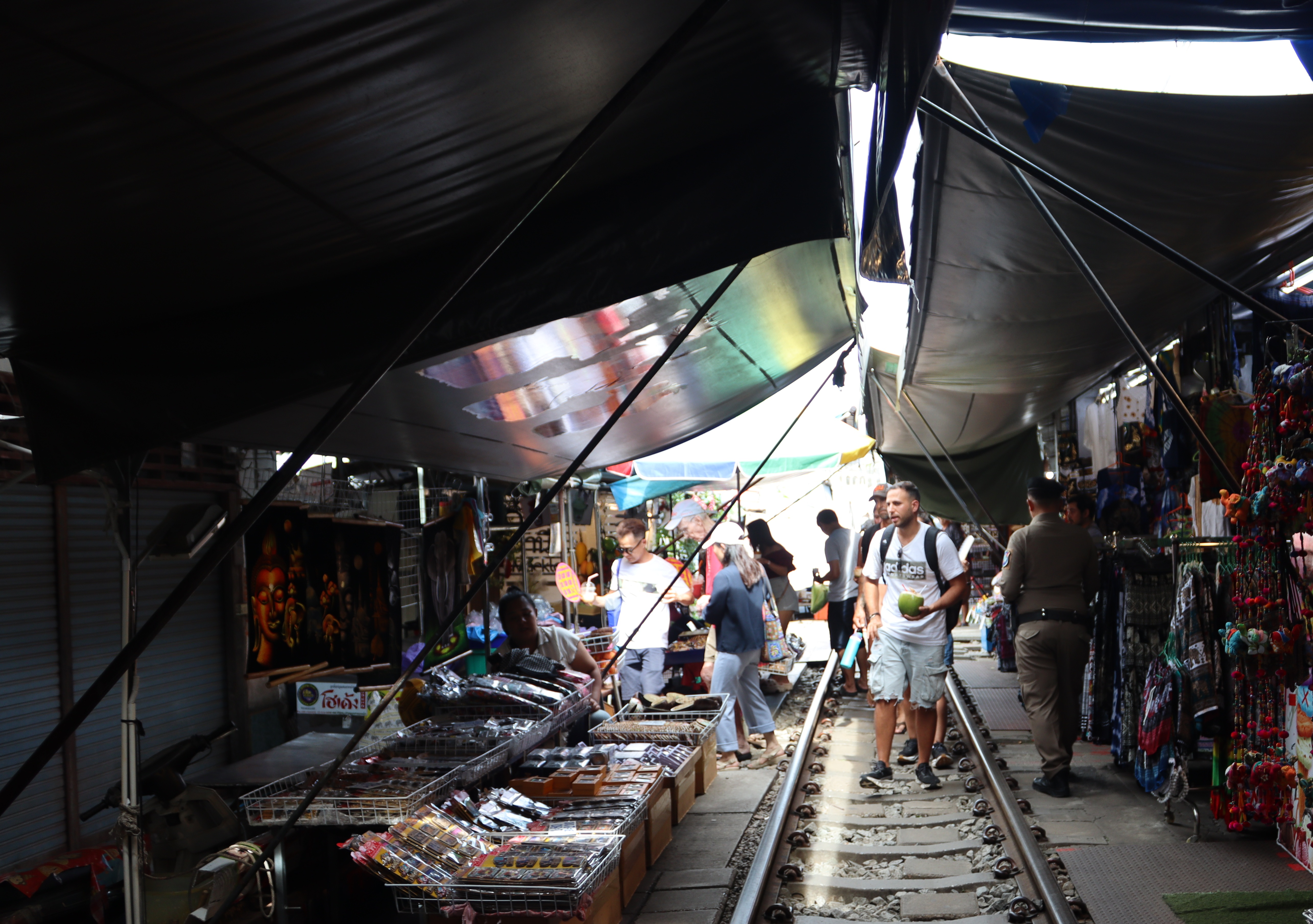 バンナクワーン停車場からメークロン駅まで、先頭車両で風に吹かれながらの列車旅。車窓は塩田、民家、学校など。メークロン駅に近づくと車内から店の商品がのぞけたり、列車到着を待ちかまえるたくさんの観光客が見えたり。とても面白い体験でした。