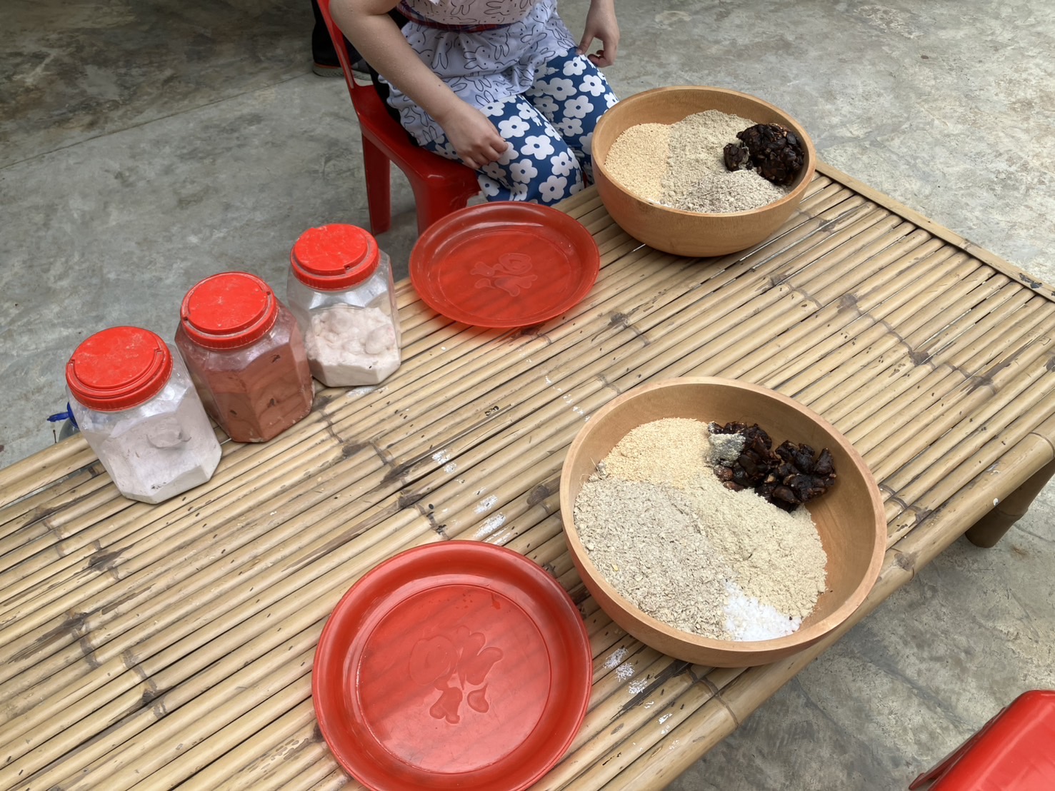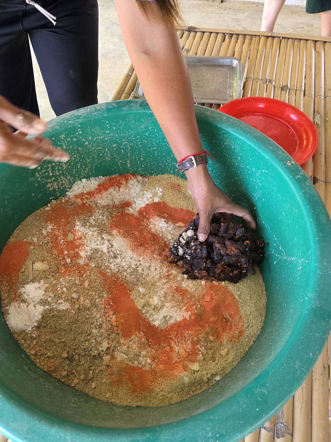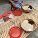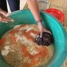 次にエサを作りました。穀物やタマリンドやカルシウム等のお薬を入れて団子にしていきます。手のひら大の団子をお皿に乗せて持っていくとゾウが鼻を伸ばして待っていてくれます。
