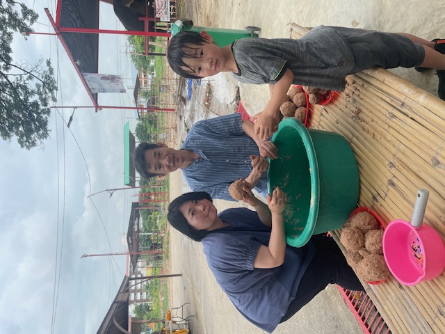 次にエサを作りました。穀物やタマリンドやカルシウム等のお薬を入れて団子にしていきます。手のひら大の団子をお皿に乗せて持っていくとゾウが鼻を伸ばして待っていてくれます。
