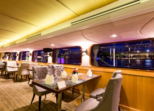 ビュッフェスタイルの船の中でもひときわ目立つワンダフルパール号!船内は非常にお洒落でバンコクのディナータイムを楽しむにはもってこいのクルーズです。デッキ席の噴水や船内のエスカレーターなど、船の中とは思えない豪華さです。クルーズ中は生バンド演奏を楽しみながら、バンコクの夜景をご堪能下さい。