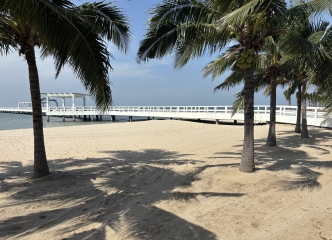 全長約4kmのロングビーチ。ヤシの木が並ぶ穏やかな海辺に立ち寄ります。主人公をはじめ、プロジェクトメンバーが距離を縮める重要な場面で登場したビーチへご案内。