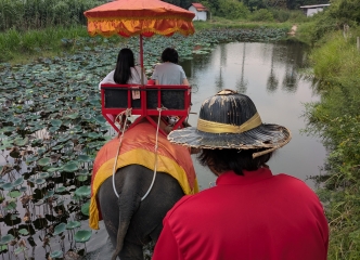 タイならではのアクティビティ、象使いと一緒に象乗りを楽しみましょう。ジャングルの中ではなく平坦な道なので、はじめての体験でもご安心いただけます。