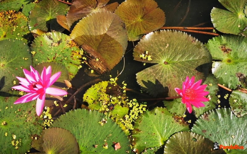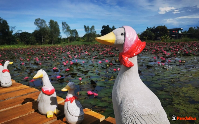 レッドロータスが咲き誇るカフェでお手洗い休憩