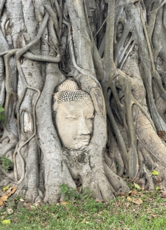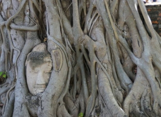ガイドブックなどで一度は目にする、ワット・マハタート。印象的な木に包まれた仏頭で有名な寺院です。1600年代中頃に胴体から落ちた仏頭が、水平に保たれたまま、根本にとりこまれた現在の姿は、奇跡そのもの。
