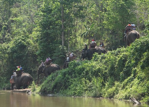 象に乗って山岳民族の集落エリアへ。川の水が適量の時は水の中にも入ります。(濡れませんのでご安心を)